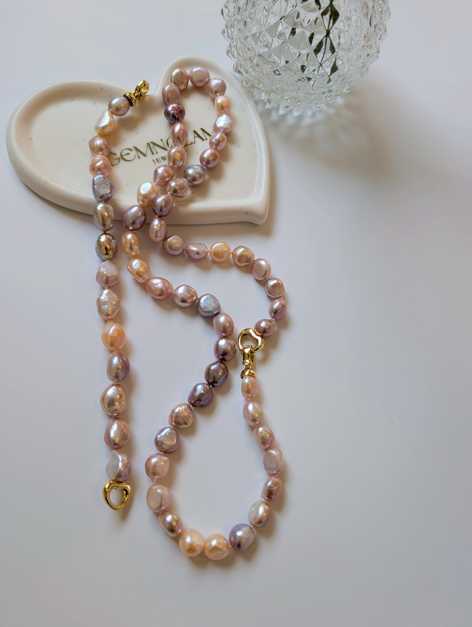 This necklace and bracelet set features genuine freshwater pearls in a soft, romantic blend of blush pink, champagne peach, and silvery lavender tones. Naturally mixed and gently luminous, the pearls showcase organic beauty and effortless charm. Finished with a heart-shaped clasp that allows the pieces to connect seamlessly, this set is easy to wear — and easy to love.