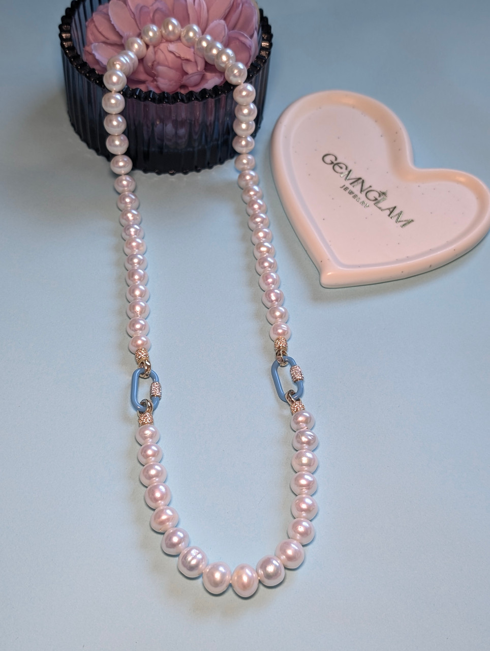 A fresh twist on classic pearls, featuring 9–11 mm near-round to oval pearls with strong luster. Each piece is finished with a color-coated carabiner clasp accented with pavé details, adding a playful, modern pop to the timeless glow. Available in two colors, and designed so the bracelet and necklace can be connected for a longer, statement look.