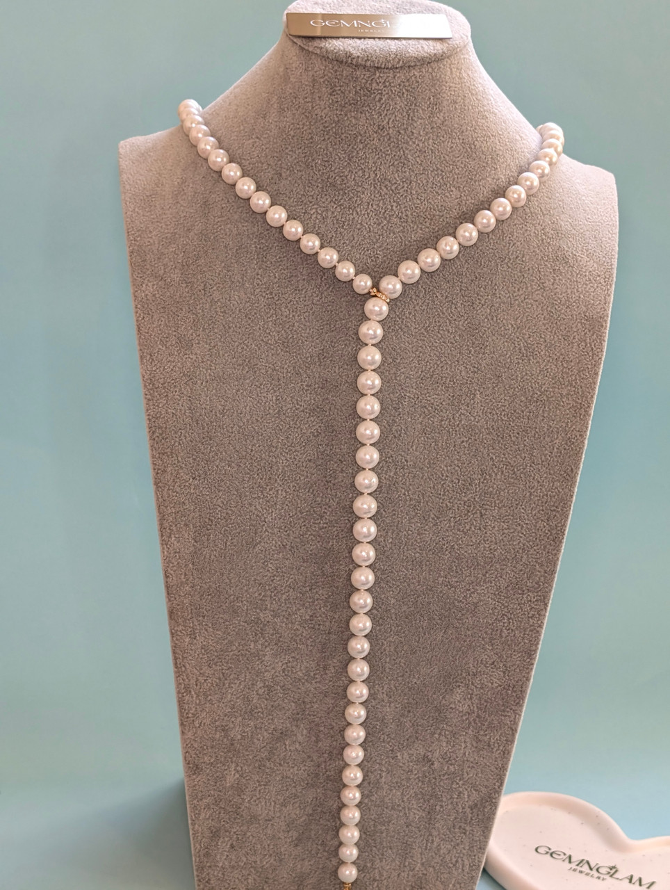 A beautifully versatile double-strand pearl necklace made of 9–11 mm pearls with clean surfaces and excellent luster. Designed to do it all, this piece transforms effortlessly: wear a single strand for a casual everyday look, layer both for a classic statement, connect them into a long necklace, style it in a Y-shape, or lock them together for an elegant, refined look.
