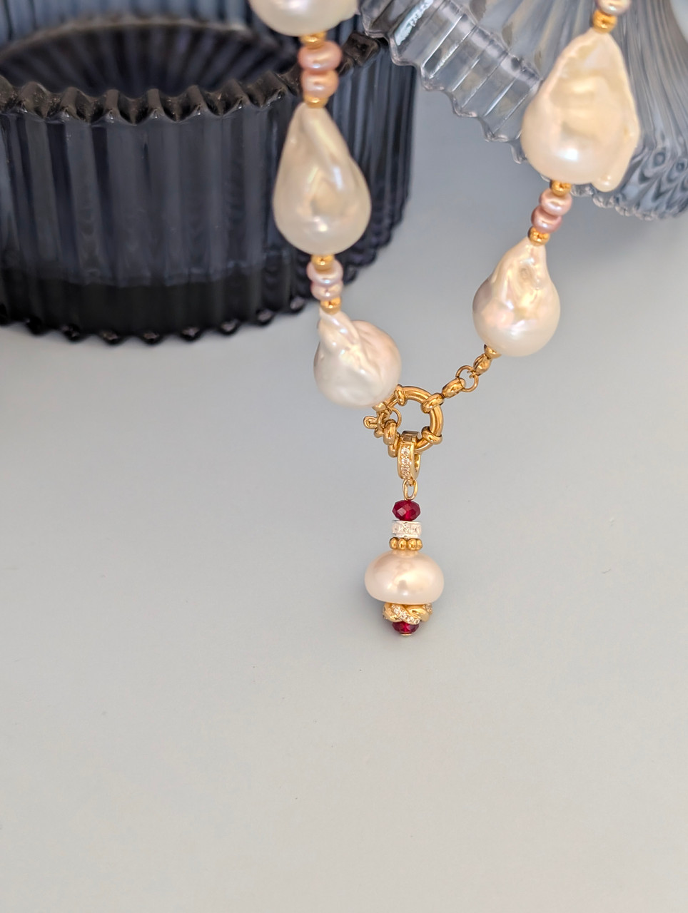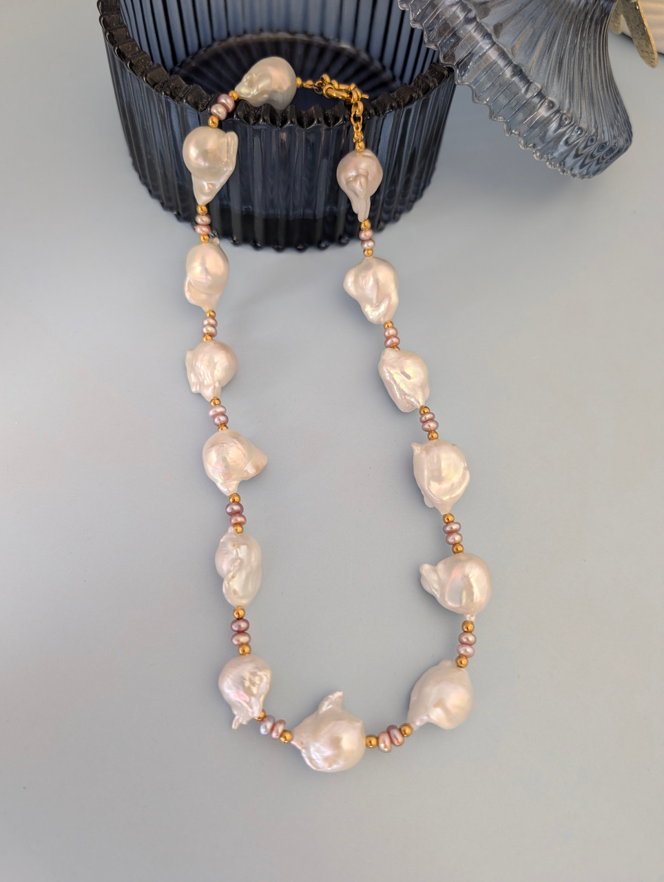 שרשרת פנינים בארוקיות בצבע סומק ירח