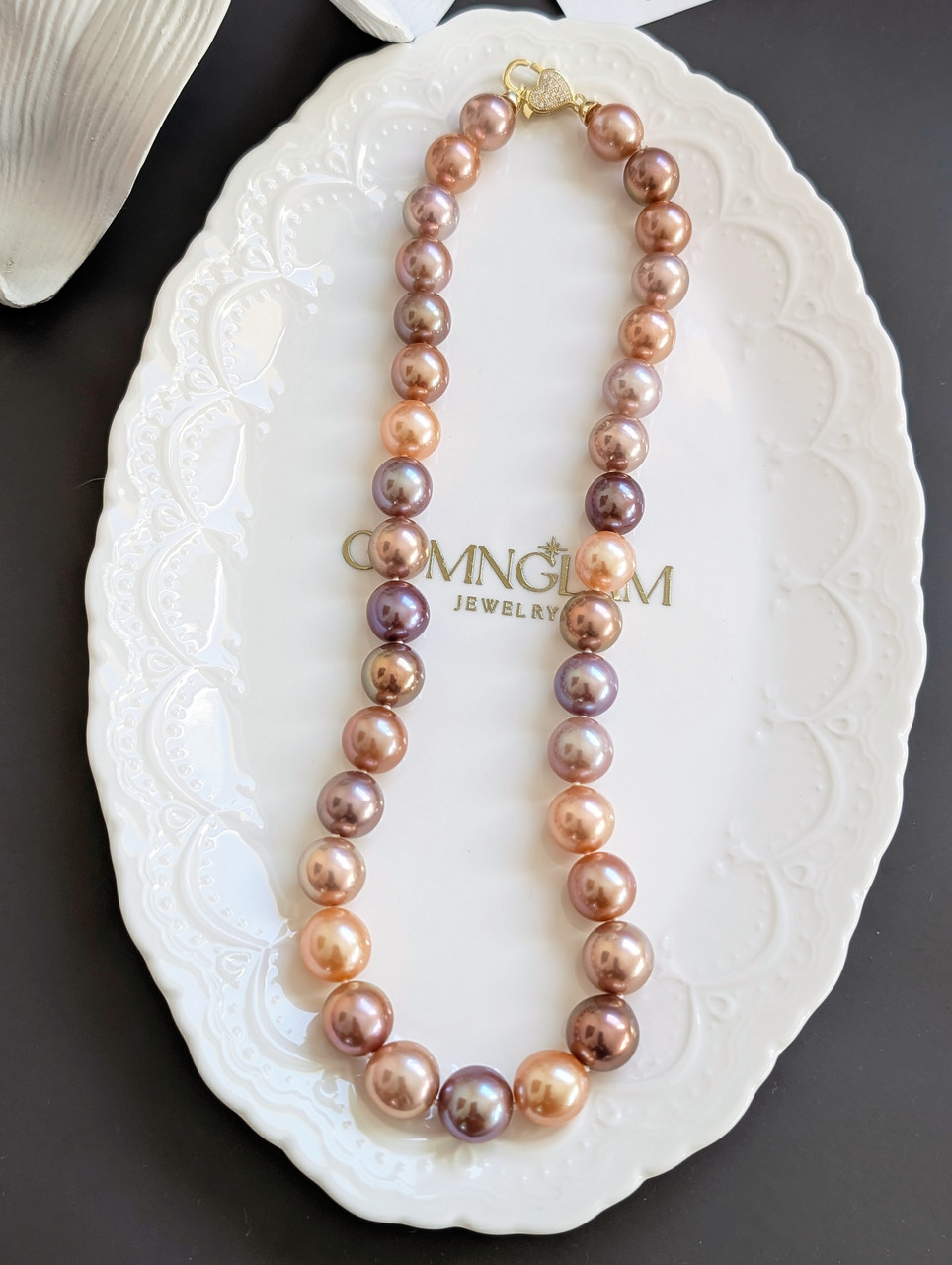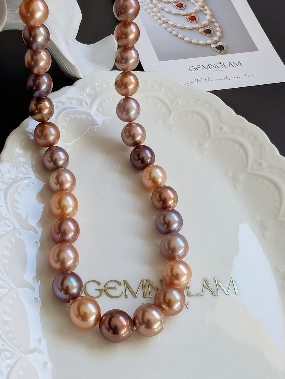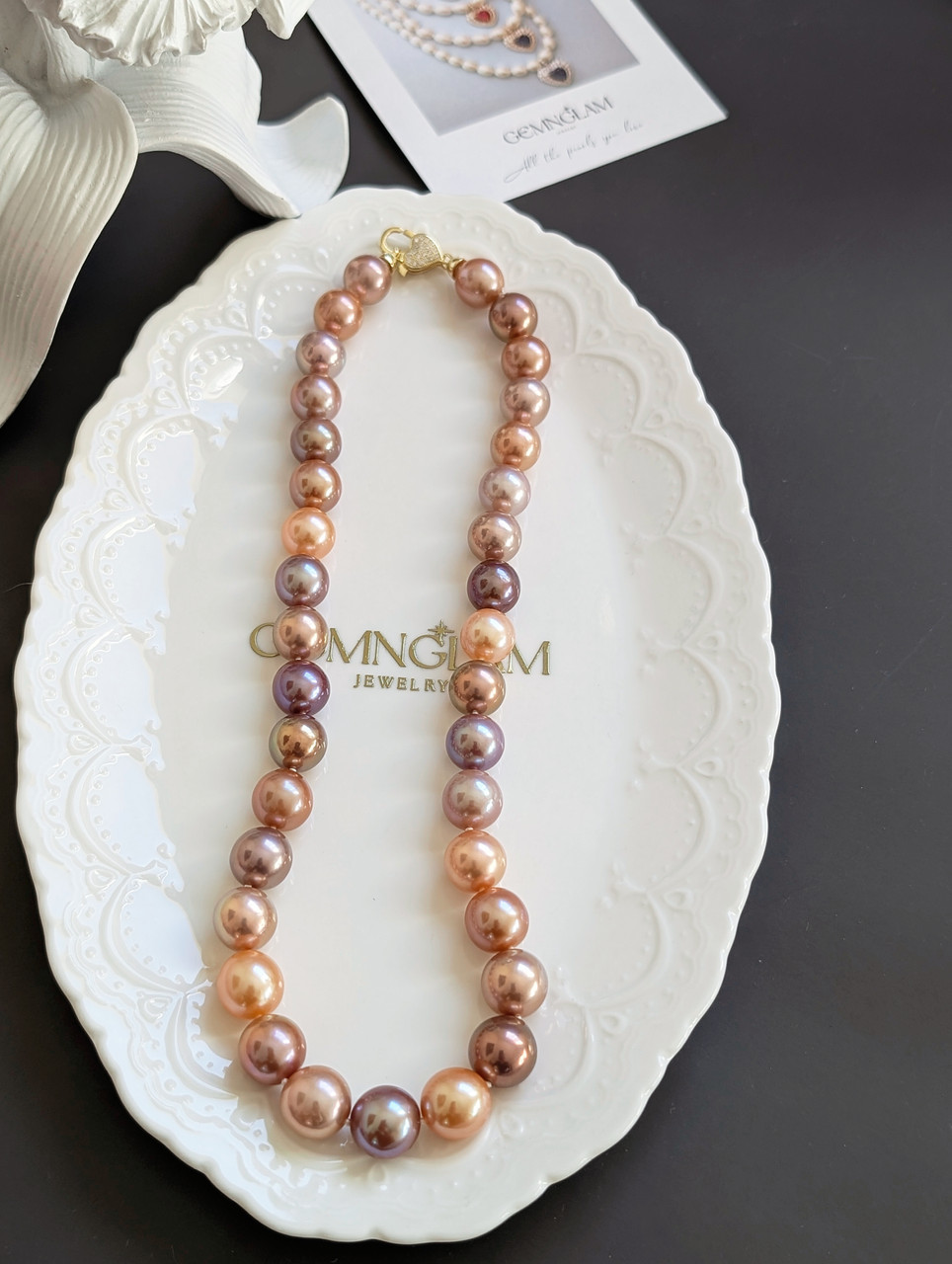 שרשרת זו, העשויה מפניני אדיסון אמיתיות בגודל 11-12 מ"מ, כוללת תערובת מעודנת של גווני אפרסק, שמפניה, ורוד וסגול. כל פנינה עגולה להפליא, עם משטחים נקיים במיוחד וברק מתכתי דמוי מראה, המשקף אור בעומק וברק יוצאי דופן.