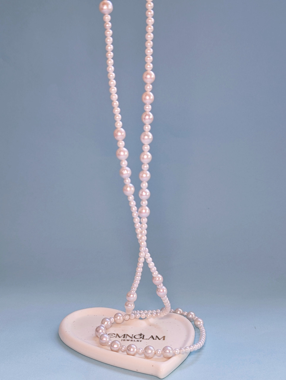 This long pearl necklace is crafted from a thoughtful mix of 5–6 mm and 9–10 mm freshwater pearls, creating a natural play of scale, movement, and rhythm along the strand. The changing sizes bring visual interest and flow, giving the necklace a modern elegance that feels dynamic rather than uniform.